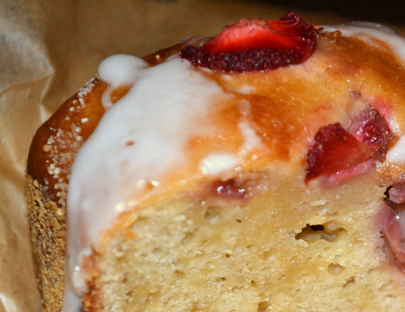 Kuchenform einfetten und mit Brösel bestreuen, die Teigmasse einfüllen und bei 180 Grad ca. 40 Minuten backen. Auskühlen lassen, den Zuckerguss anrühren und über den Kuchen rinnen lassen, sofort mit den Erdbeerscheiben belegen.