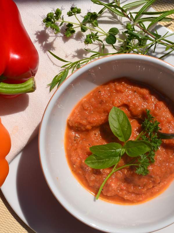 Version benötigt man nur einen Mixstab zum Pürieren. Sollten noch grobe Teile vorhanden sein, etwa Tomatenkerne, dann empfiehlt es sich, die Masse noch durch ein Sieb zu streichen. Eventuell zum Verdünnen mit etwas Wasser aufgießen. Natürlich kann man diese Kaltschale auch erwärmen und als Suppe genießen.