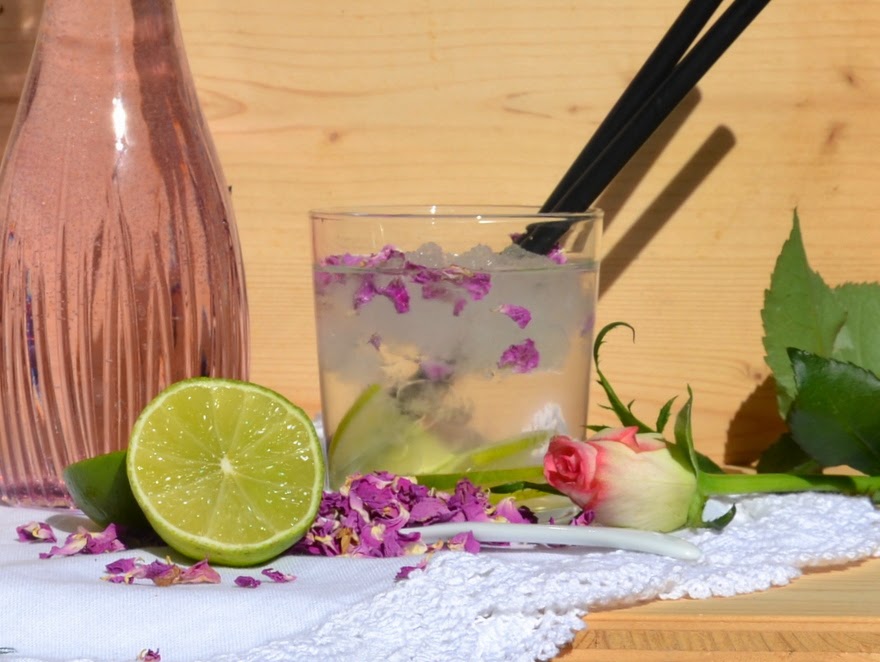 Limettenhälfte in dünne Scheiben schneiden. Kaltes Wasser mit Rosenblütenblättern und Limettenscheiben ansetzen und gut eine Stunde im Kühlschrank ziehen lassen. Mit Eiswürfeln servieren. Das Wasser kann zwei- bis dreimal erneuert werden. Wenn man möchte, dann füllt man das Wasser durch ein kleines Sieb ab.
